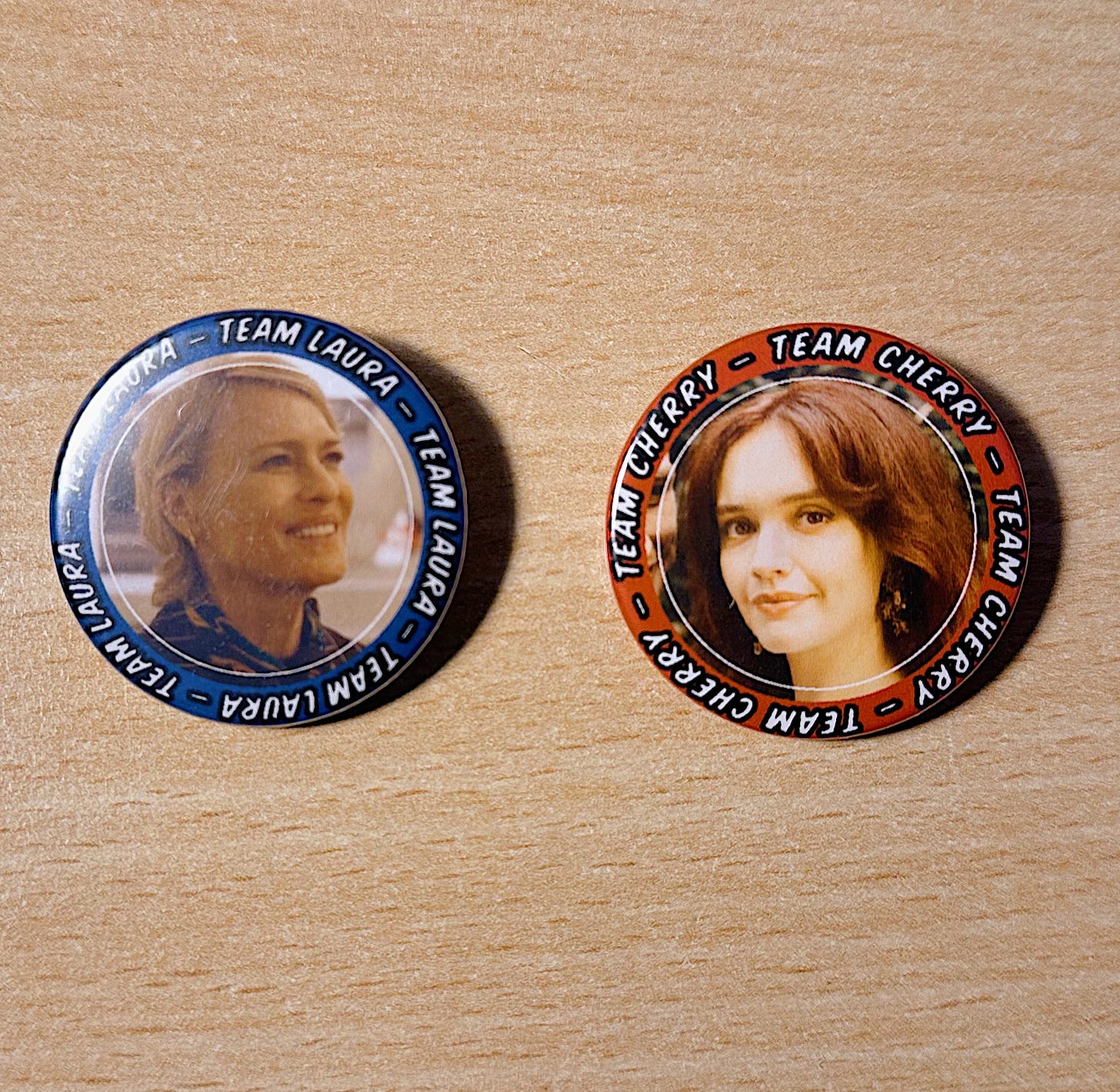 Producer, over the din “They’re badges! Team Cheery or Team Laura!”